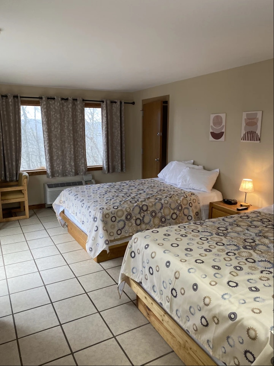 ##Duration - **1-30** Night Stay Available - **Check In:** 3pm - **Check Out:** 11am STREET LEVEL ##About Room 210 has two queen beds and a private deck. The room is also equipped with mini refrigerators, microwaves and a one-cup Keurig’s hair dryer shampoo and body wash and conditioner. The $87.00 per night rate allows for a maximum occupancy of 4 people, The Hickory Ridge Motel is smoke free including on the deck.